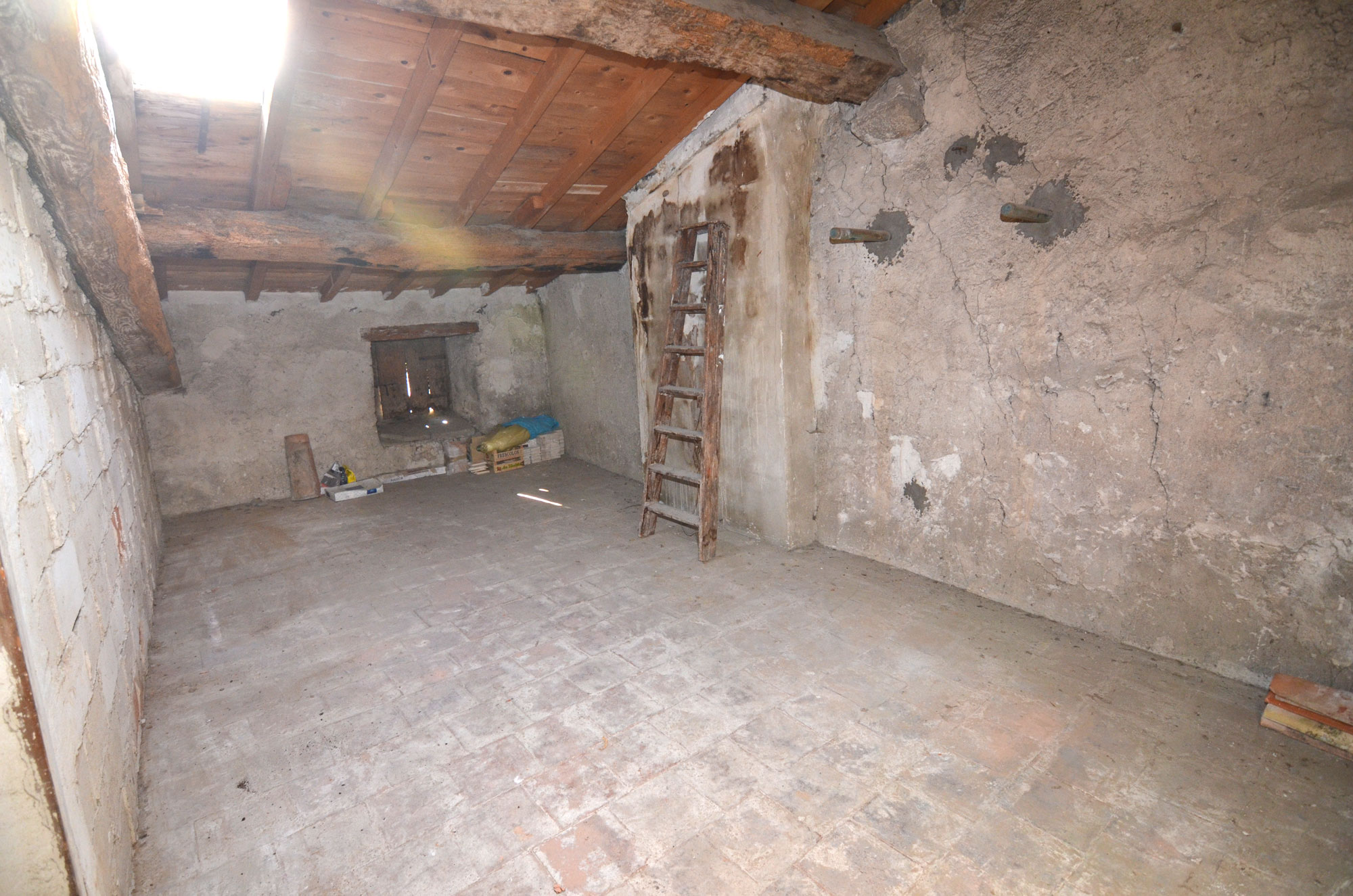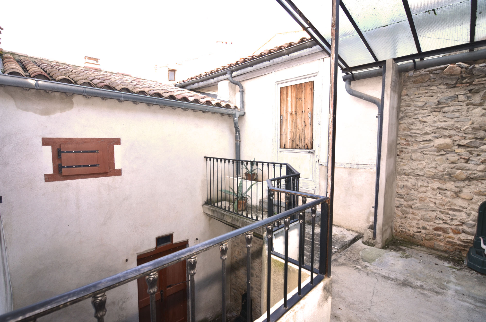 Cet ancien bâtiment agricole, transformé en habitation et partiellement rénové, a conservé de nombreux éléments d'origine. Le rez-de-chaussée comprend un salon et une salle à manger, un bureau aménagé en chambre avec une salle de bains moderne. La cuisine de style campagnard s'ouvre sur une cour intérieure. De cette cour, on accède également au garage et à l'ancienne petite écurie. Dans la maison, un bel escalier d'origine mène au premier étage. On y trouve trois chambres, une salle d'eau et des toilettes séparées. La troisième chambre donne sur une terrasse surplombant la cour. De la terrasse, on accède à une autre pièce et au premier étage du garage. Le deuxième étage comprend plusieurs greniers.